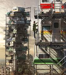 The Stacks are a type of refugee shanty villages that were constructed on the outskirts of most major cities during the rise of the global energy crisis. The Stacks are named due to how the dozens of trailers and similar mobile living quarters that make up the spaces are stacked on top of one another in "stacks", held together by metal beams, pipes and makeshift girders. They were created to save space, labor, and resources. This cheap construction caused the over crowded homes to become a breeding ground for theft, murder, molestation and other heinous activities. The top level or "roof" of each stack is blanketed with a patchwork array of old solar panels that provided supplemental power to the units below. A bundle of hoses and corrugated tubing snake up and down the side of each stack, supplying water to each trailer and carrying away sewage (although not every Stack is reported to possess such luxuries). Very little sunlight make it to the bottom level (known as the "floor") and the ground between the stacks are clogged with abandoned cars and trucks that have to be cleared away by construction cranes before a new stack can be created.