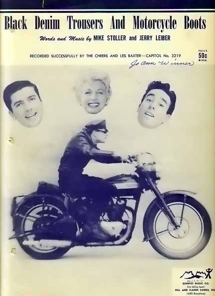 On September 30, 1955 the actor James Dean died after crashing his Porsche 550 Spyder nearly head-on into another car near the intersections of highways 46 and 41 in California. Just a week before Dean's death, a little rock and roll vocal group called The Cheers had released a single called "Black Denim Trousers and Motorcycle Boots", written by the famous lyrical/composer team Jerry Leiber and Mike Stoller. (Cool bit o'trivia for you: one of the members of The Cheers was Bert Convy, who would go on to be a game show host for Tattletales, Super Password and Win, Lose or Draw.) "Black Denim Trousers and Motorcycle Boots" is a snappy little number that tells the tale of a motorcycle lovin' fool that was the "terror of Highway 101", losing his life after colliding with a diesel truck. Most likely its inspiration came from the 1953 Marlon Brando biker film The Wild One.
