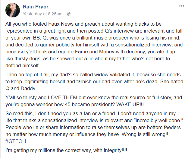 Old age is really doing a number on Q because he has forgotten that Black people don't let you just talk about their family members and get away with it. Richard's daughter, Rain Pryor fired up her fingers on social media and had this to say in response to the accusations: